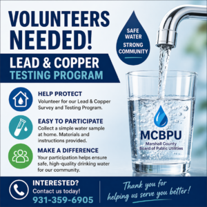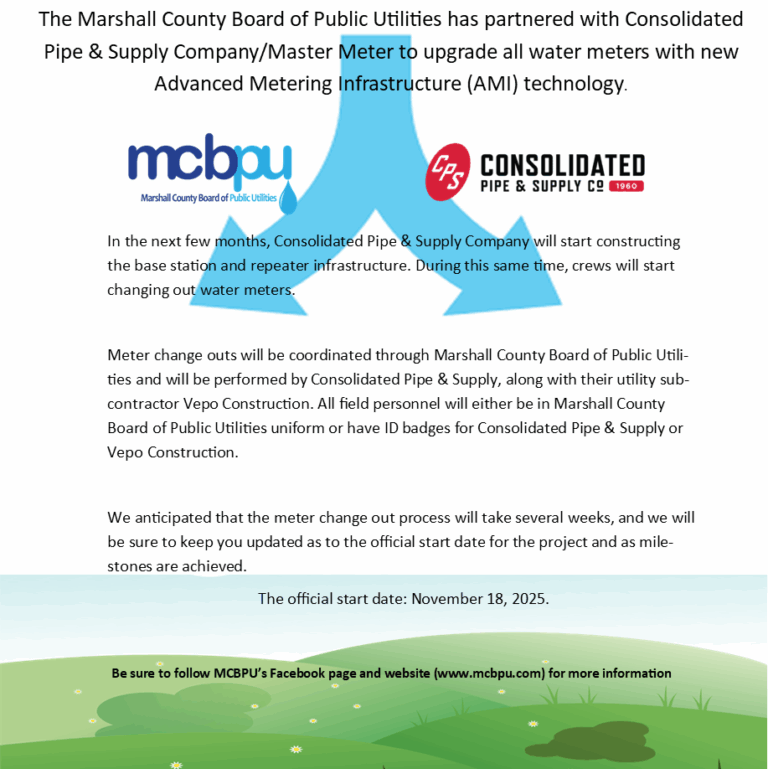 The Marshall County Board of Public Utility was established in 1969 to serve potable drinking water to the rural residents of Marshall County. Thanks to the hard work and dedication of past and present Elected Officials, With a customer base of about 4900 customers, we serve most all of Marshall County. Our goal is to provide our residents with superior water, fast and efficient service and excellent customer service.